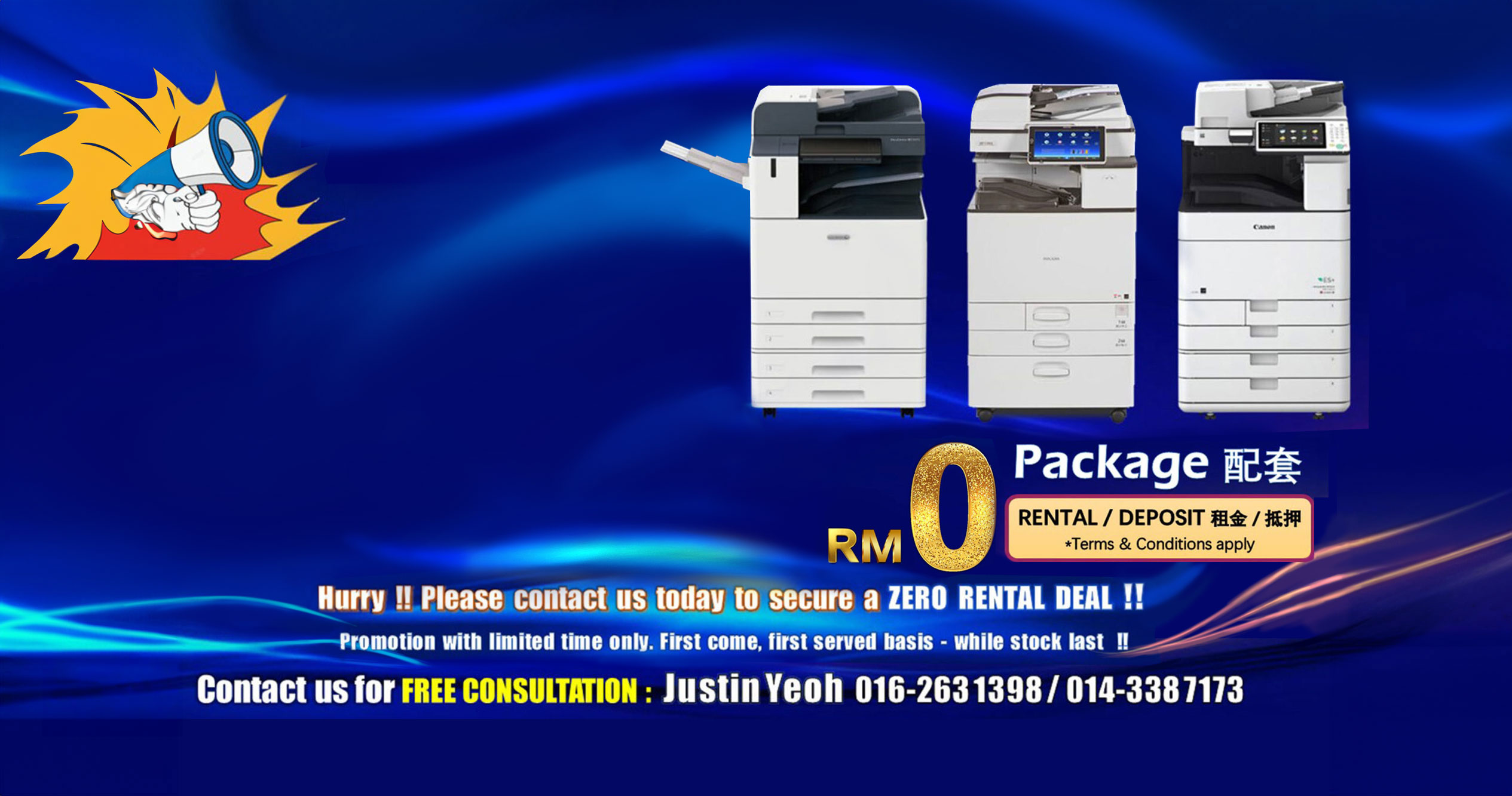 Get the Zero-Rental Package, which includes a black & white or colour machine, monthly committed copies, print and copy functions, with optional scan and fax features. It supports both A3 and A4 sizes, and comes with an up to 5-year contract.